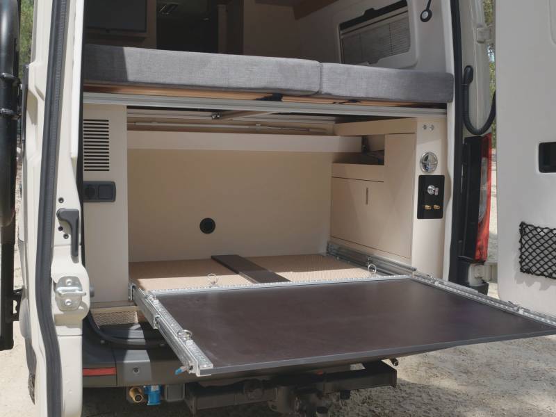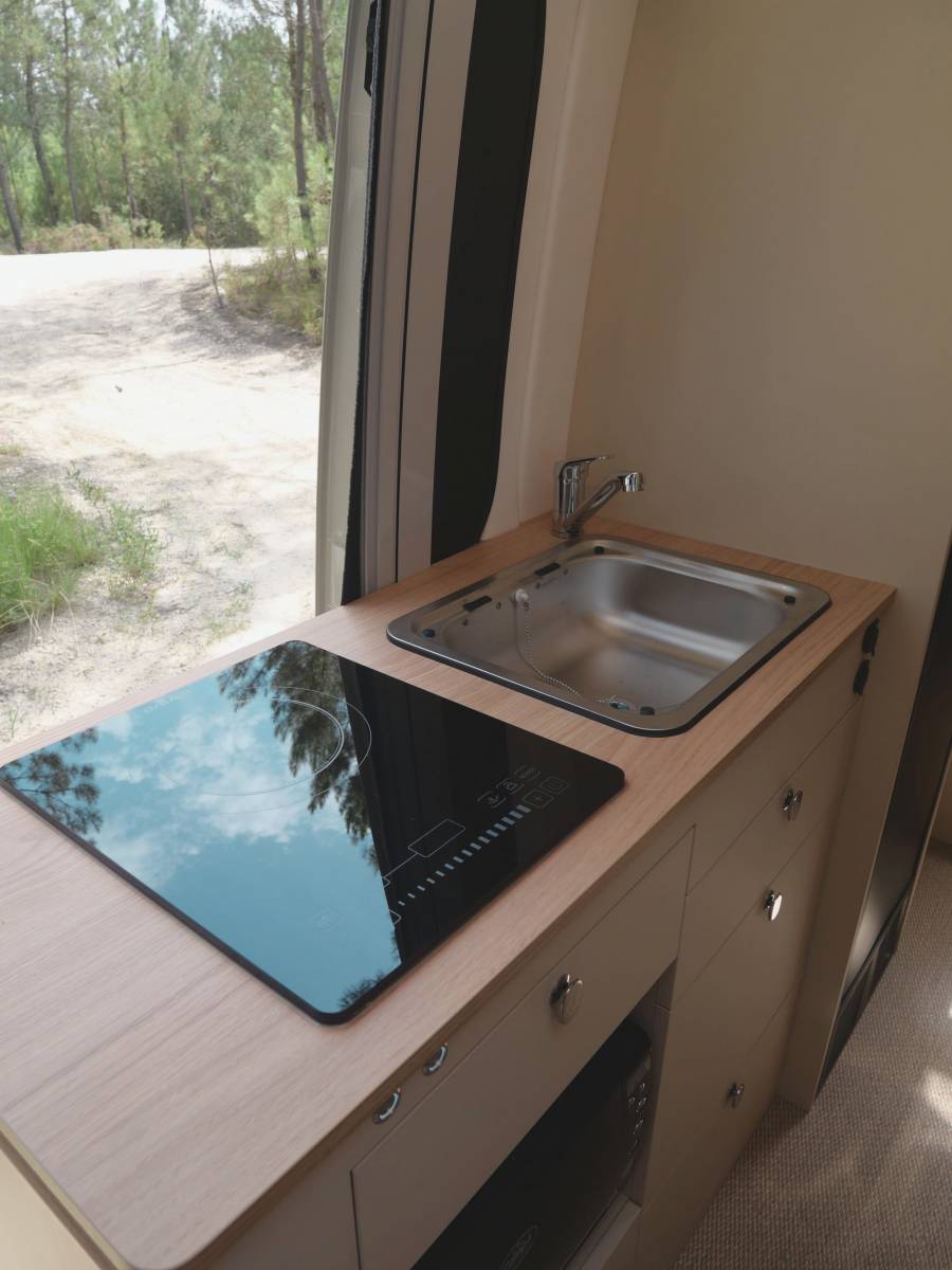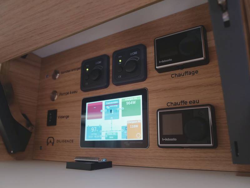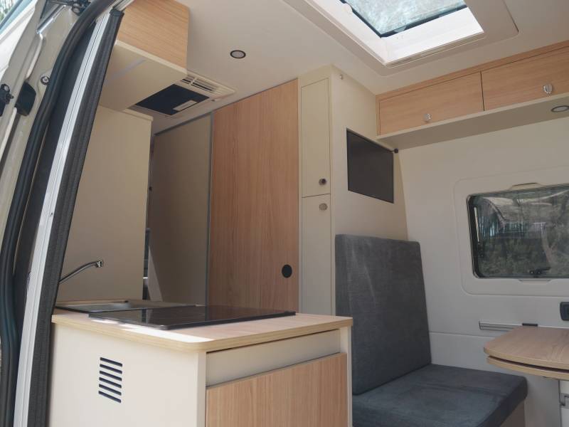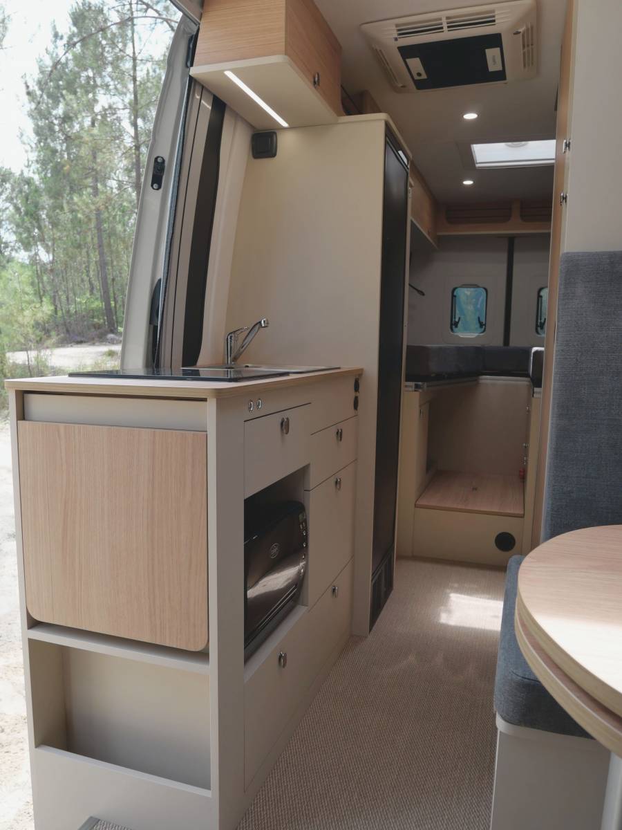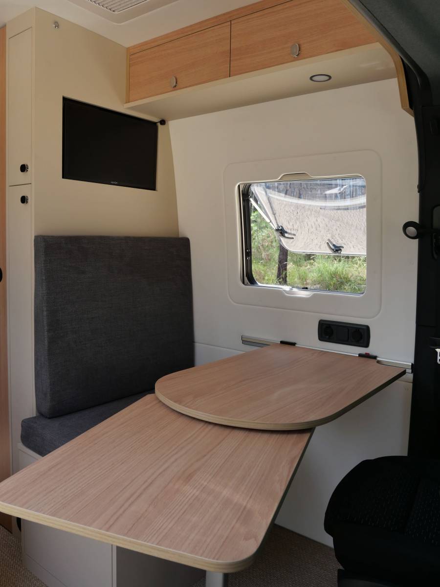Nous avons eu le plaisir de travailler sur ce projet de diligence sur mesure avec Martine et Bertrand, un charmant couple originaire de Noirmoutier. Passionnés par le voyage et la camping car depuis toujours, ils ont fait confiance à notre équipe pour réaliser le véhicule de leur rêve sur base de Mercedes-Benz Sprinter 4x4 long (7 mètres). Cet agencement est bien différent de ce que nous proposons habituellement. Il offre un maximum de confort, de rangements et présente la particularité du couchage longitudinal sur le principe des lits jumeaux. La dinette se situe à l'avant grâce aux sièges pivotants et une banquette une place fabriquée sur mesure. Un sanitaire généreux avec WC chimique, douche et lavabo vient dans la continuité de la banquette. En face, nous retrouvons l'espace cuisine avec une plaque un feu induction, un évier et un grand réfrigérateur de 138 L. L'agencement intègre de nombreux rangements hauts ainsi qu'une généreuse penderie. A la demande de nos clients, nous avons installé deux télévisions indépendantes, l'une côté couchage, l'autre côté salon.