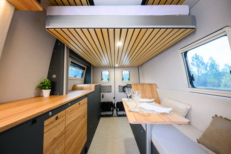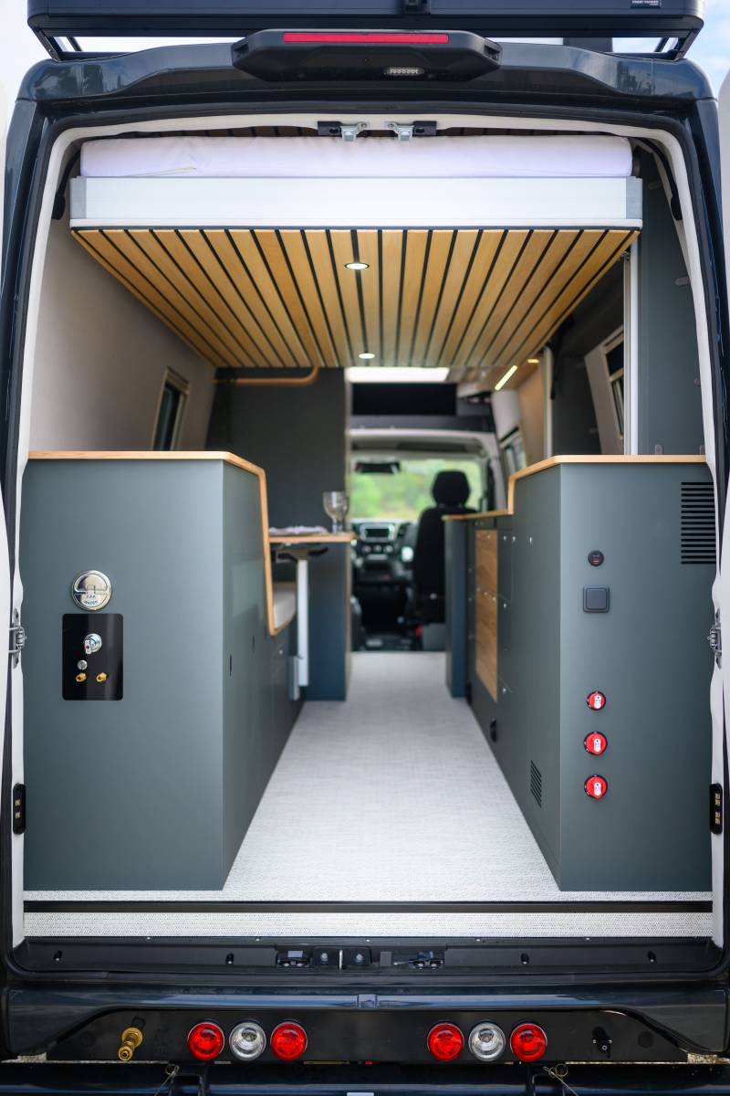 Pour le couchage il suffit de lever les yeux ! Le lit longitudinal électrique prend place en position arrière au dessus de la banquette et de la cuisine. Il offre un accueil à la fois ferme et cosy et des dimensions de type habitat de 140 x 200 cm.