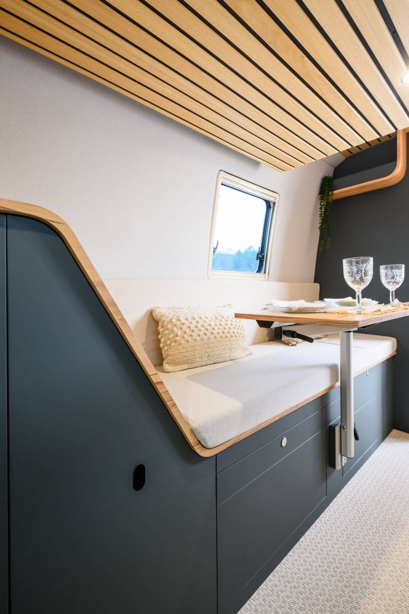 Nous arrivons sur la pièce principale de cette agencement avec la banquette tout en arrondi qui accueille dans son assise le rameur avec un astucieux système d'ouverture. Ce mécanisme imaginé par Romain (ébéniste de ce projet) permet de sortir et de ranger le rameur de façon très pratique et rapide afin de s'en servir dans le couloir.