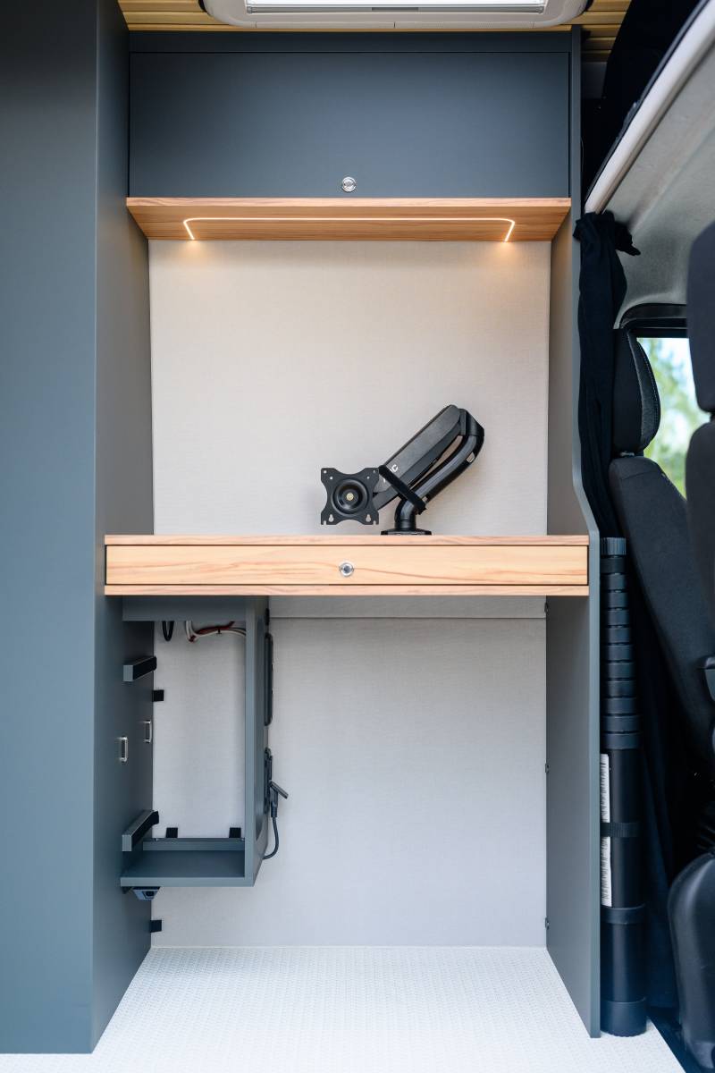 La porte latérale s'ouvre directement sur l'espace de travail. Nous avons intégré les côtes spécifiques à l'installation de l'ensemble de son matériel (écrans, tour, souris, clavier, pad...) ce qui lui permet une ergonomie 100% en adéquation avec son utilisation.