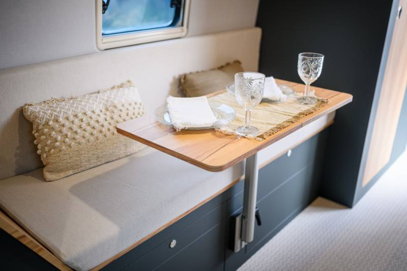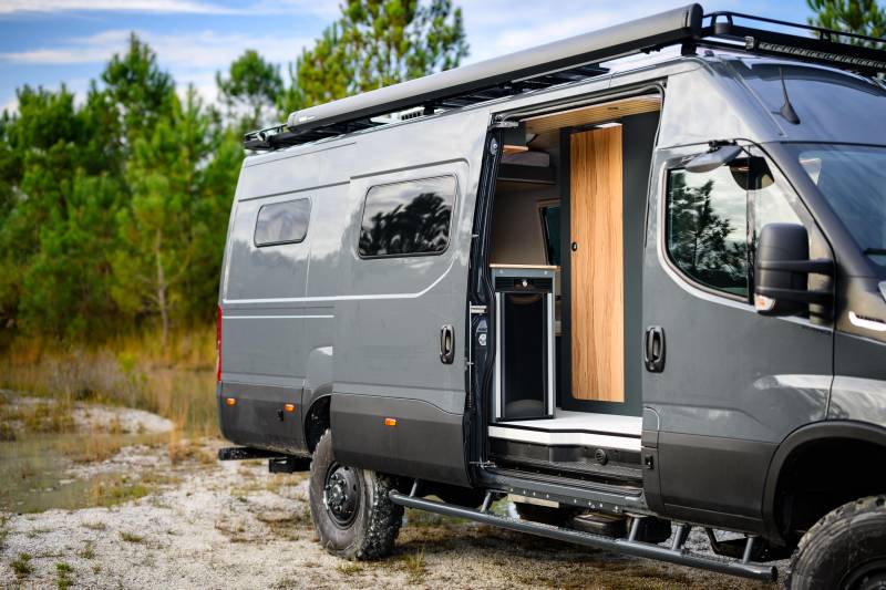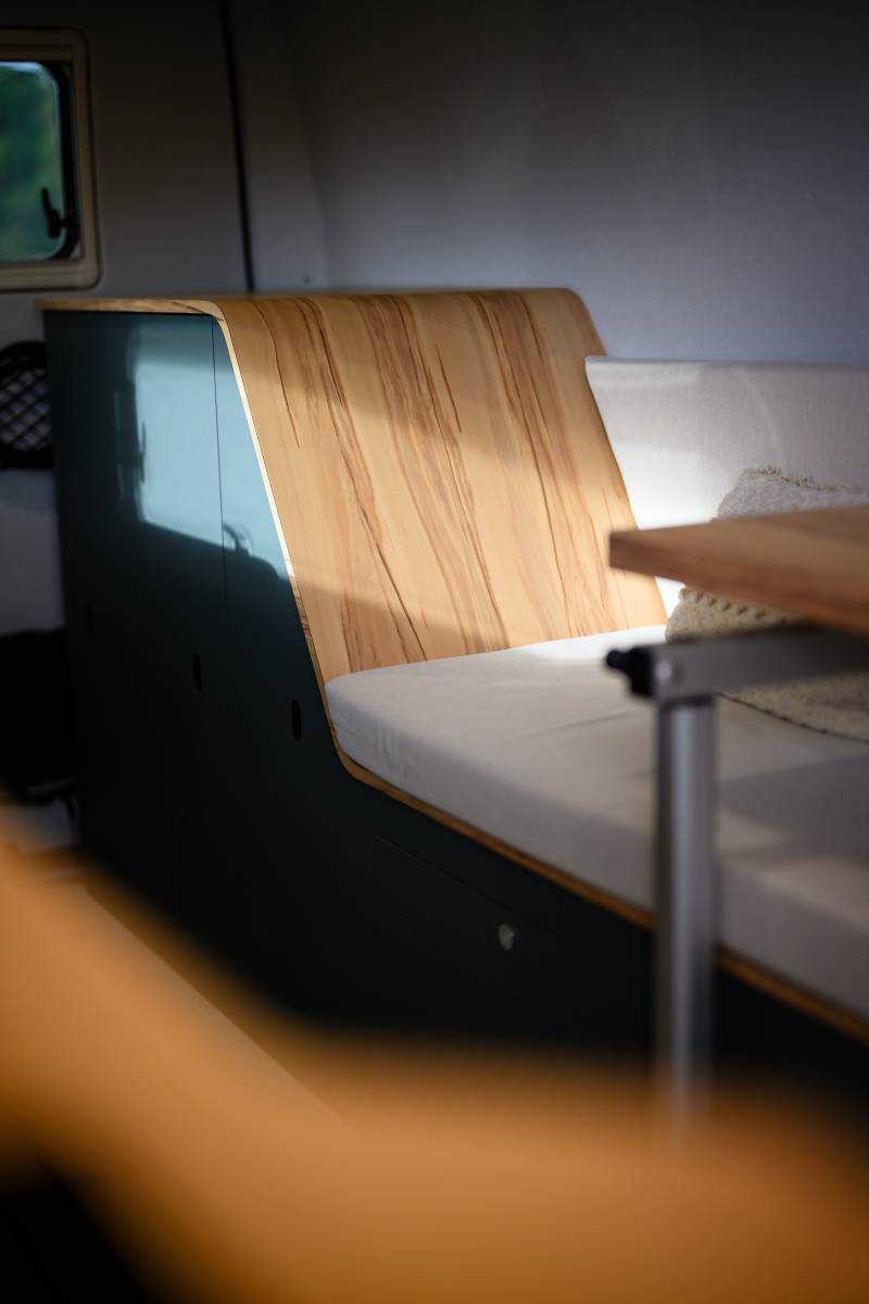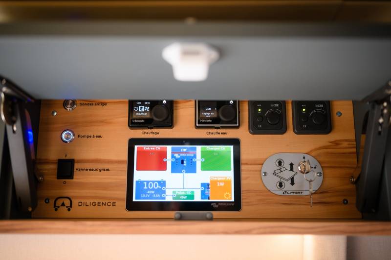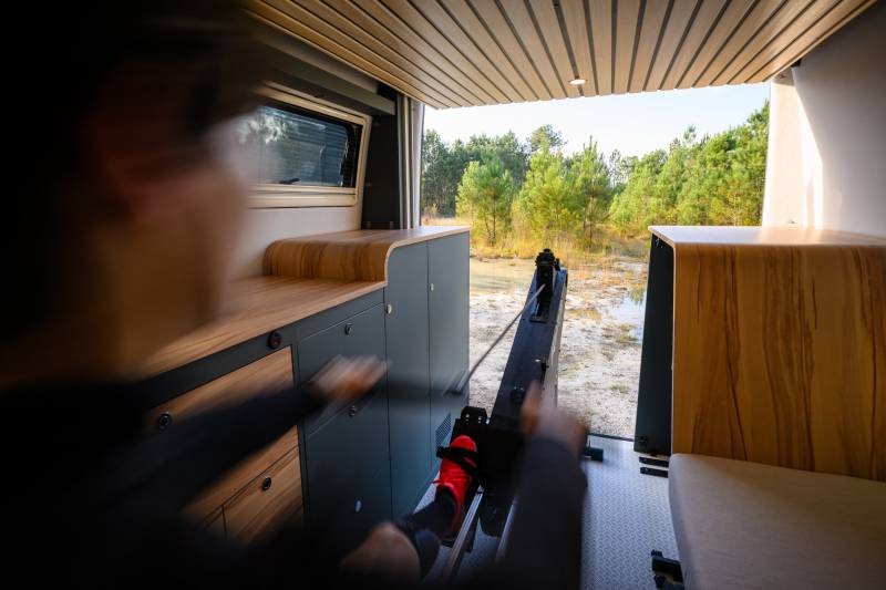 Ce véhicule exceptionnel, nous l'avons aménagé sur mesure pour Stéphan. Cet architecte de réseau se servira de sa Diligence comme habitat mais également bureau et espace de sport. En effet, il pratique de façon quotidienne le rameur (2 à 3 heures par jour) et nous avons conçu son véhicule afin qu'il puisse se servir de cet appareil à l'intérieur.