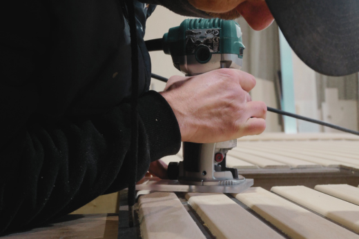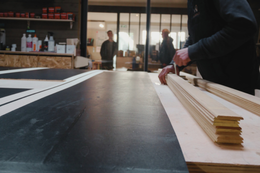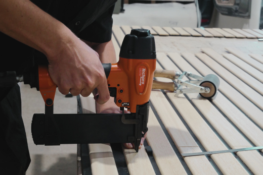 Les lattes sont ensuite positionnées sur le gabarit peint. Elles sont d’abord contrecollées avant d’être clouées pour une résistance optimale.